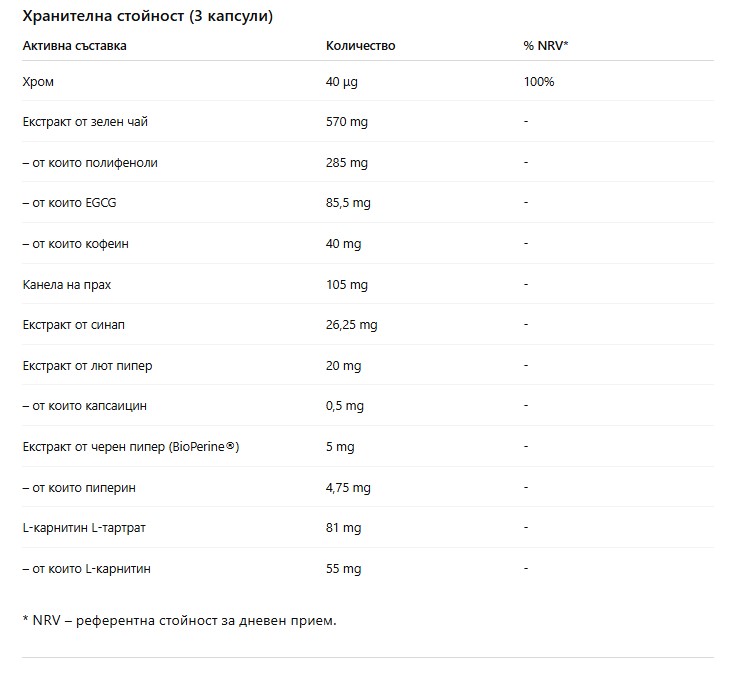 Екстракт от зелен чай (Camellia sinensis L.) (лист), капсула (хидроксипропил метилцелулоза), пълнител: дикалциев фосфат, канела на прах (Cinnamomum cassia) (кора), L-карнитин L-тартрат, екстракт от синап (Sinapis alba) (семе), екстракт от лют пипер (Capsicum annuum) (плод), антислепващ агент: силициев диоксид, екстракт от черен пипер (Piper nigrum) (плод), хромов хлорид.